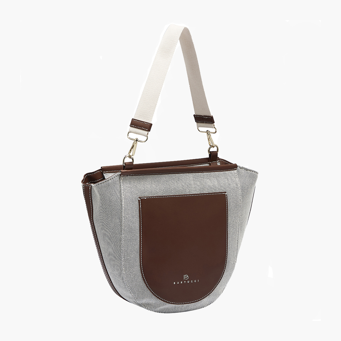 Bartuggi statement women’s bag, crafted from a combination of fabric in modern shades with faux leather details. Featuring a unique oval shape that stands out for its stylish design. Inside, it offers two pockets, one with a zipper closure, while the front has an additional pocket for easy access to essentials. Comes with a storage pouch and two long shoulder straps, providing versatile carrying options. Perfect for distinctive all-day looks to make a statement.