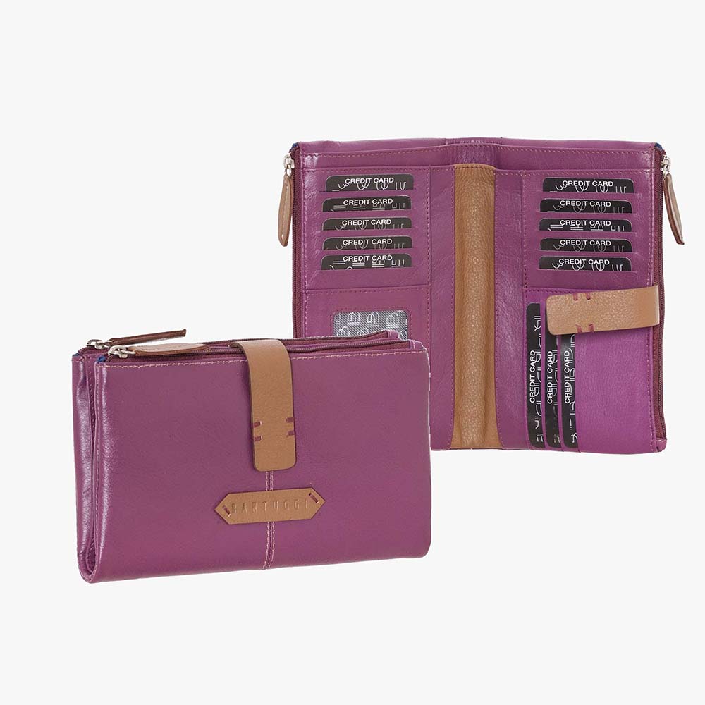 Γυναικείο δερμάτινο πορτοφόλι BARTUGGI σε έντονα χρώματα από μαλακό δέρμα, με εξωτερική τσέπη κερμάτων με φερμουάρ.