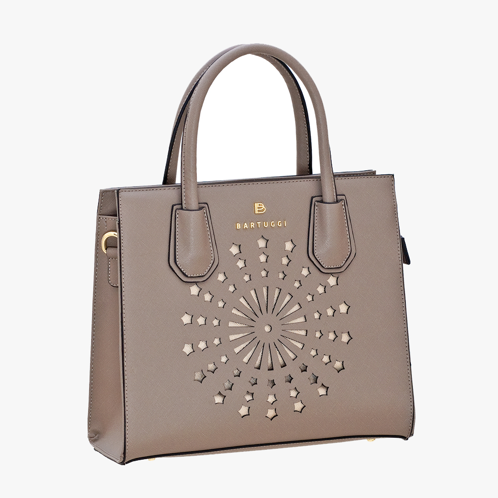 Κλασική, δίχρωμη τσάντα BARTUGGI με διάτρητο σχέδιο, ιδανική για θηλυκές και επαγγελματικές εμφανίσεις. Διαθέτει εσωτερικά ένα μικρό χώρισμα με φερμουάρ, εσωτερικά τσεπάκια -το ένα με φερμουάρ-, καθώς και έξτρα ιμάντα ώμου