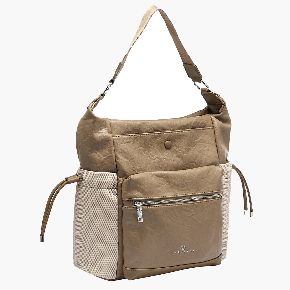 Δίχρωμη, εντυπωσιακή, ευρύχωρη και πρακτική τσάντα Bartuggi με κομψό συνδυασμό χρωμάτων και εξαιρετική ποιότητα υλικού. Ιδανική για να τη φοράτε όλη την ημέρα, συνδυάζοντας στυλ και λειτουργικότητα. Εσωτερικά διαθέτει 3 τσεπάκια, το ένα με φερμουάρ, για οργανωμένη αποθήκευση. Εξωτερικά, μπροστά υπάρχουν 2 τσεπάκια (1 με φερμουάρ και 1 με σούστα), 2 στο πλάι, και 1 τσεπάκι στο πίσω μέρος με φερμουάρ. Περιλαμβάνει φανέλα αποθήκευσης για την προστασία της.