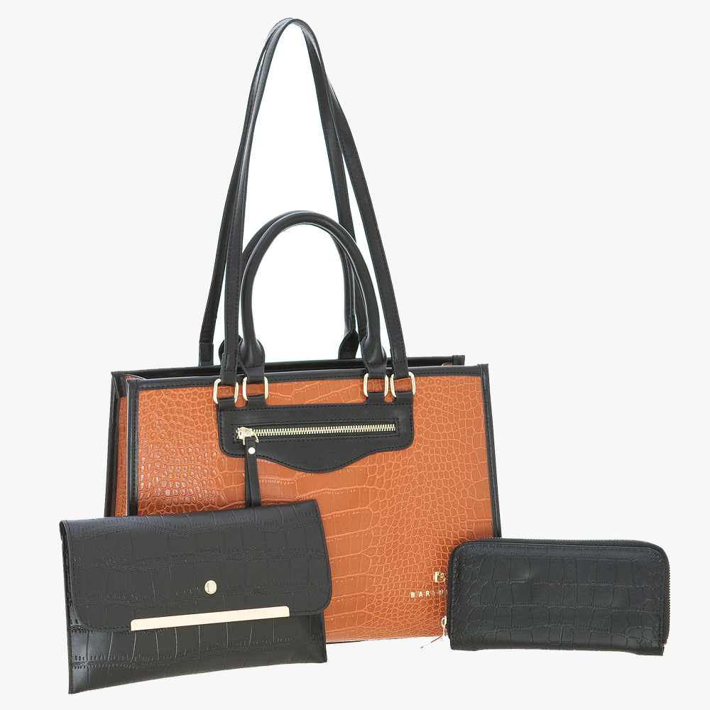 Διαχρονική τσάντα BARTUGGI από κροκό υλικό με ασορτί πορτοφόλι (με 8 θήκες για κάρτες, θήκες για χαρτονομίσματα, θήκη για κέρματα) και ασορτί φακελάκι με χρυσές λεπτομέρειες. Διαθέτει εσωτερικά 2 τσεπάκια, εκ των οποίων το 1 κλείνει με φερμουάρ, εξωτερική τσέπη με φερμουάρ στο μπροστινό μέρος και επιπλέον ιμάντα ώμου.